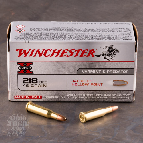 This is .218 Bee Winchester Super-X 46gr. Hollow Point Ammo. This round features include ultra-high velocity, pinpoint accuracy and explosive fragmentation. Weight rearward design enhances bullet accuracy. This ammo is ideal for prairie dog, coyote, woodchuck, and other small varmints. Muzzle velocity of 2760fps. This ammo comes packed in 50rds. per box.