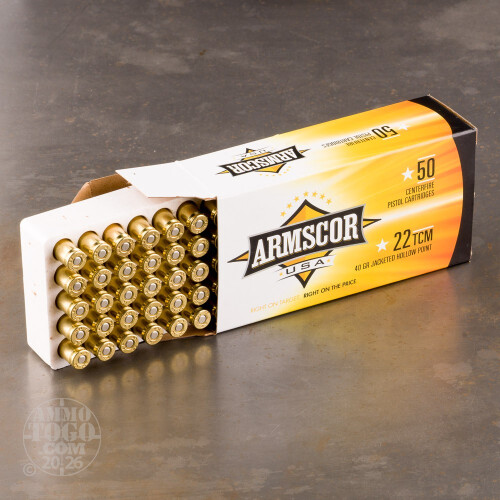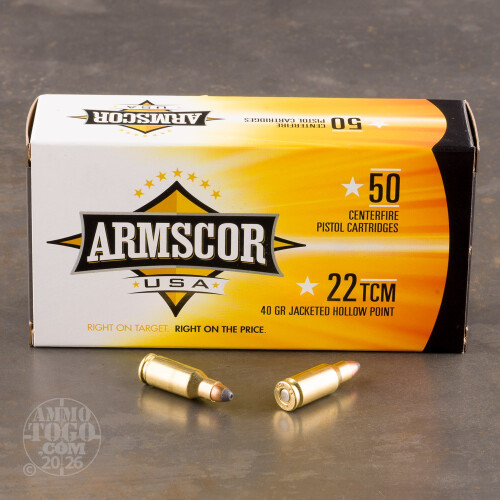 This is 22 TCM ARMSCOR USA 40gr. Jacketed Hollow Point Ammo. Armscor USA is an ISO 9001 certified company. That means you can shoot with confidence with every box. Cartridges and components are produced by Armscor, so quality control is monitored throughout the entire manufacturing process. Shoot one and feel the difference. This ammo is brass cased, boxer primed, and non-corrosive. Muzzle velocity of 1875 FPS. This ammo is packed in 50rd. boxes.