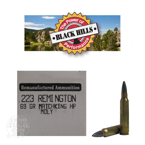 This is .223 Black Hills 69gr. Remanufactured Seconds Sierra MatchKing Hollow Point Moly Coated Ammo. The moly coating reduces barrel wear, residue in the barrel, and in some cases even enhances velocity. This Black Hills remanufactured ammunition is produced on the same production line as the Black Hills new manufactured ammunition and is subject to the same testing and inspection procedures as new ammunition. This ammo goes through Black Hills stringent inspection tests and due to minor cosmetic blemishes on the bullet or casing, it then becomes factory seconds (white box) ammo. Performance is not affected. This is premium ammo, with a great savings. Black Hills supplies all five US military branches with ammunition. There are many Law Enforcement Agencies using Black Hills nationwide. They only use the best components available. Black Hills Ammunition is highly respected all over the country. This ammo is very accurate, dependable, 100% non-corrosive, boxer primed and reloadable. It comes packed in 50rd. boxes.