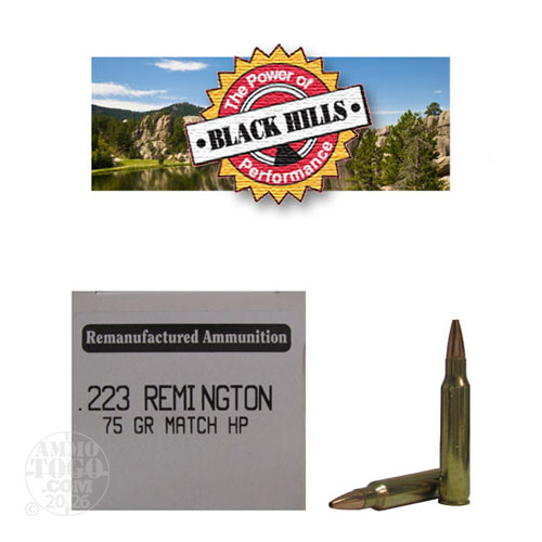 This is .223 Black Hills 75gr. Remanufactured Seconds Heavy Match HP Ammo. This Black Hills remanufactured ammunition is produced on the same production line as the Black Hills new manufactured ammunition and is subject to the same testing and inspection procedures as new ammunition. This ammo goes through Black Hills stringent inspection tests and due to minor cosmetic blemishes on the bullet or casing, it then becomes factory seconds (white box) ammo. Performance is not affected. This is premium ammo, with a great savings. Black Hills supplies all five US military branches with ammunition. There are many Law Enforcement Agencies using Black Hills nationwide. They only use the best components available. Black Hills Ammunition is highly respected all over the country. This ammo is very accurate, dependable, 100% non-corrosive, boxer primed and reloadable. It comes packed in 50rd. boxes.
