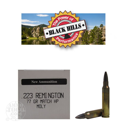 This is .223 Black Hills 77gr. New Seconds (Cosmetic Imperfections) Sierra MatchKing Hollow Point Moly Ammo. This ammo goes through Black Hills stringent inspection tests and due to minor cosmetic blemishes on the bullet or casing, it then becomes factory seconds (white box) ammo. Performance is not affected. This is premium ammo, with a great savings. Black Hills supplies all five US military branches with ammunition. There are many Law Enforcement Agencies using Black Hills nationwide. They only use the best components available. Black Hills Ammunition is highly respected all over the country. This ammo is very accurate, dependable, 100% non-corrosive, boxer primed and reloadable. It comes packed in 50rd. boxes.