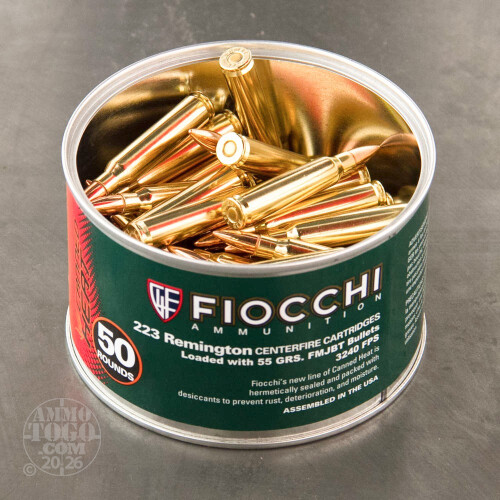 This is 223 Fiocchi 55gr. Full Metal Jacket Boattail Ammo. Fiocchi's new Canned Heat line of ammo is hermetically sealed and packed with dessicants to prevent rust, deterioration, and moisture. This ammo is brass cased, boxer primed and non-corrosive. This ammo is manufactured by Fiocchi and assembled in the USA. It is premium quality ammo at an affordable price. It comes packed in 50rd. sealed Canned Heat cans. Muzzle Velocity: 3240 fps.