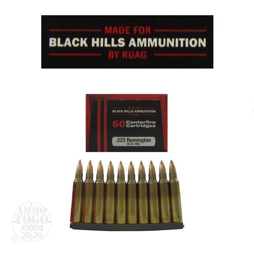 50rds - 223 Rem Black Hills/Ruag 55gr. FMJ Ammo Details