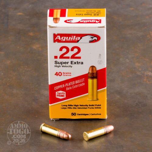 This is Aguila .22 Long Rifle High Velocity Solid Point Ammo. This ammo has a 40gr. copper coated lead bullet that travels at 1250 FPS at the muzzle. It comes packed in 50rd. boxes.