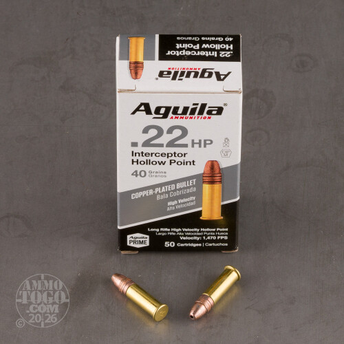 This is Aguila Interceptor .22 Long Rifle 40gr. Hollow Point Ammo. This ammo travels at a screaming 1470 feet per second. This is the fastest .22LR 40gr. load available it is 35 FPS faster than CCI Velocitor. It is packed in 50rd. boxes.