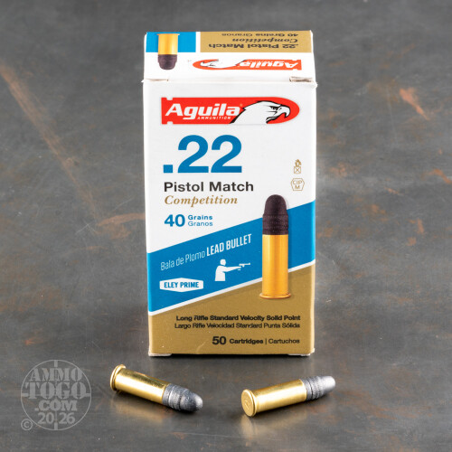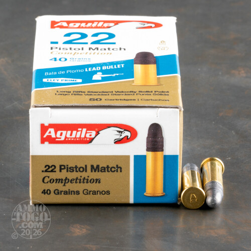 This is 22LR Aguila Pistol Match 40gr. Solid Point Ammo. This ammo has a 40gr. lead bullet that travels at 1080 FPS at the muzzle. This ammo is specifically designed to be shot in a handgun. It has a special blended powder to give the optimum rate of burn from a pistol length barrel. This ammo is extremely accurate. We have several customers that have done very well in competitions with this ammo. It comes packed in 50rd. boxes.