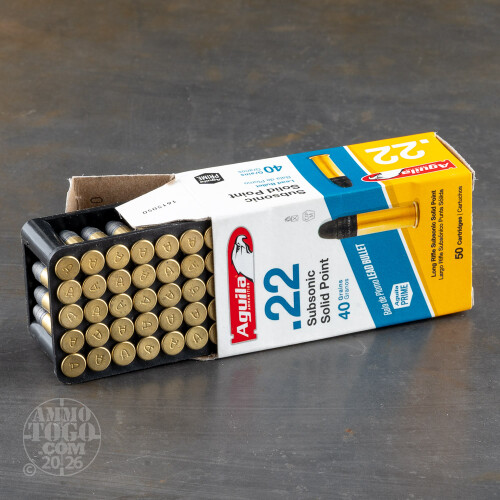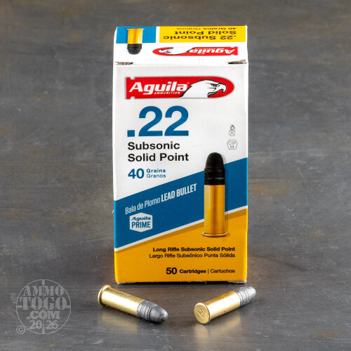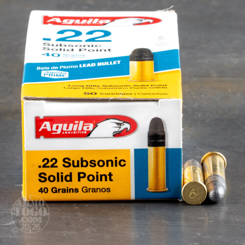 This is Aguila .22 Long Rifle Sub-Sonic Solid Point Ammo. This ammo has a 40gr. lead bullet that travels at 1023 FPS at the muzzle. It comes packed in 50rd. boxes.