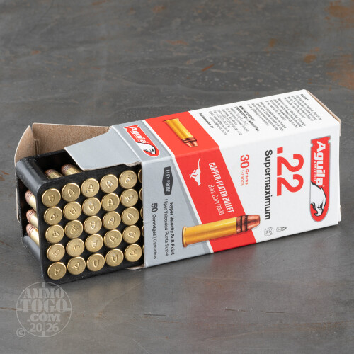 This is Aguila .22 Long Rifle Super Max Hyper Velocity Solid Point Ammo. This ammo has a 30gr. copper coated lead solid point bullet that travels at 1750 FPS at the muzzle. This is the fastest .22LR money can buy. It comes packed in 50rd. boxes.