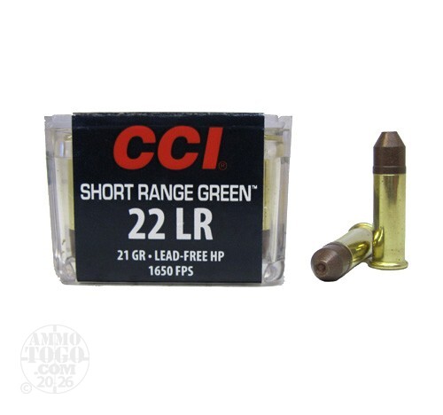 This is .22 Long Rifle CCI Short Range Green 21gr. Hollow Point LEAD FREE Ammo. CCI is known for their quality .22 Long Rifle Ammo. It comes packed in 50rd. recloseable plastic boxes. Muzzle Velocity: 1650 fps.