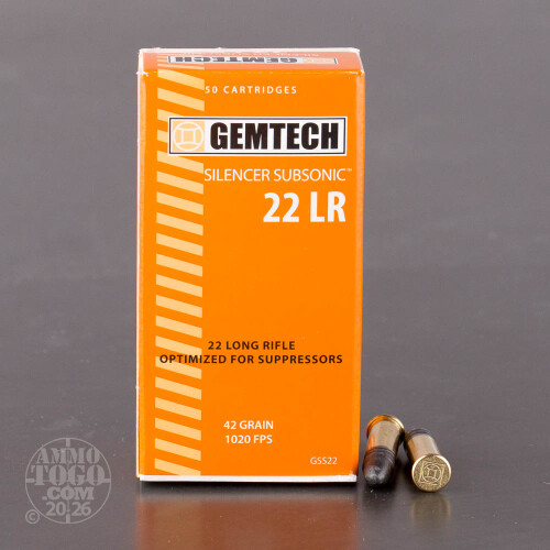 This package contains 50 rounds of Gemtech Silencer Subsonic .22LR ammunition. Each round is loaded with a 42 grain lead round nose projectile. These subsonic rounds combine a heavy-weight bullet, clean-burning powder, and a premium lubricant on the lead projectile, to produce consistent velocities and hard-hitting terminal performance at subsonic, suppressor friendly speeds.