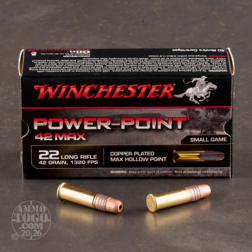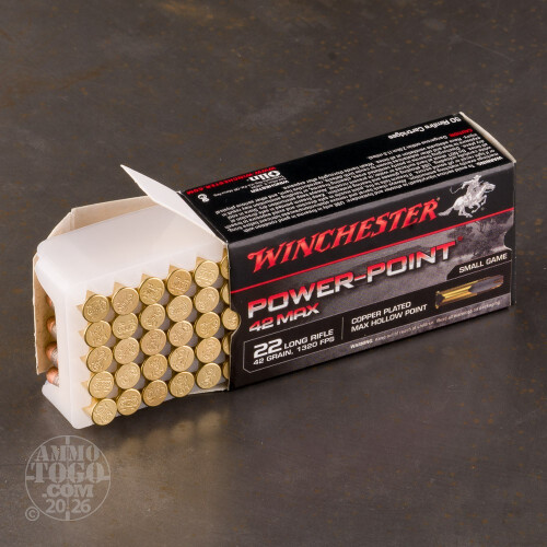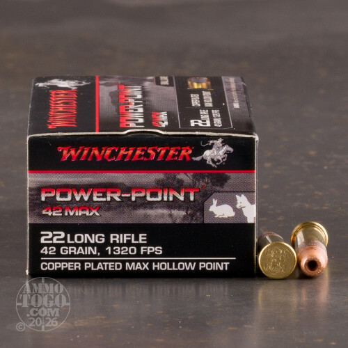This is 22LR Winchester Power-Point 42 Max 42gr. Copper Plated Hollow Point Ammo. Winchester Power-Point is the high velocity rimfire brand people trust for accuracy, lethality, and proven performance. Made for hunters and shooters of all types, Power-Point helps ensure success, time after time. It comes packed in 50rd. boxes. Muzzle Velocity: 1320 fps.