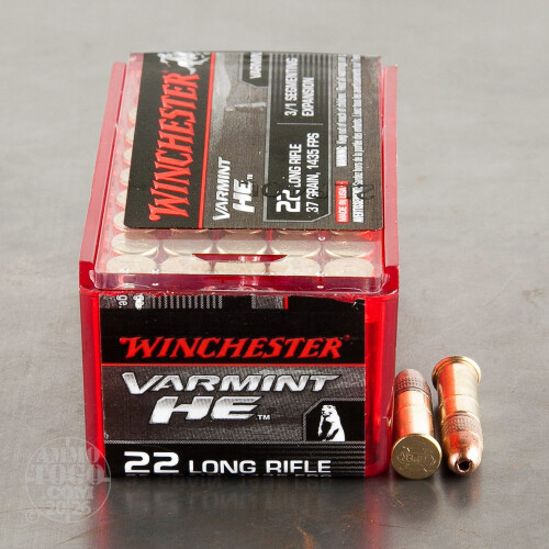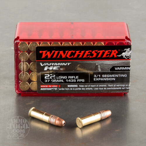 This is .22 LR Winchester Varmint HE 37gr. 3/1 Segmenting Expansion HP Ammo. This hollow point bullet fragments into three segments for explosive expansion with a solid rear core for improved penetration. The muzzle velocity is 1435 fps. This ammo comes packed in 50rd. boxes.