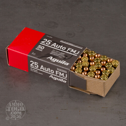This is 25 Auto Aguila 50gr. Full Metal Jacket Ammo. This ammo is brass cased, boxer primed and 100% non-corrosive. They are the exclusive manufacturers of ammo for the Mexican military and police forces. This ammo is manufactured to military and SAAMI specs. It is packed in 50rd. boxes.