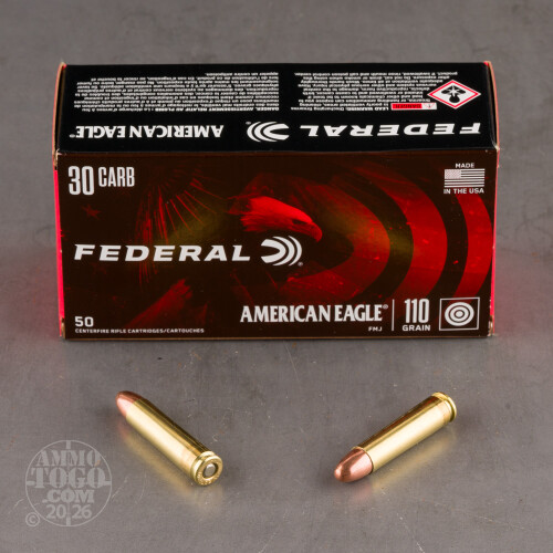 This is 30 Carbine Federal American Eagle 110gr. Full Metal Jacket Ammo. This is quality American made target ammo at an affordable price. This ammo is brass cased and boxer primed. It comes packed in 50rd. boxes.