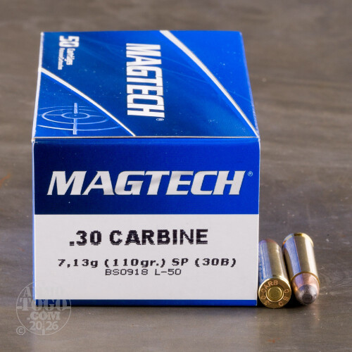 This is 30 Carbine Magtech 110gr. Soft Point Ammo. 30 Carbine rifles are still common throughout the country, and now Magtech has created a soft point load that will turn it into an effective small to medium game rifle. This ammo is brass cased, boxer primed, and non corrosive. These rounds come packaged 50rds to a box. Muzzle Velocity: 1990 FPS.