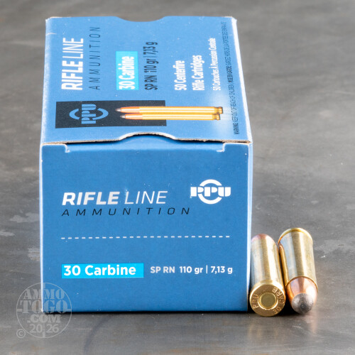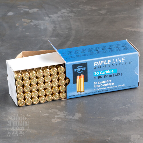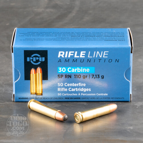 This package contains 50 rounds of Prvi Partizan .30 Carbine ammunition. Each round is loaded with a 110 grain round nose soft point projectile. These soft point bullets feature a soft exposed lead nose which delivers controlled and uniform expansion upon target impact.