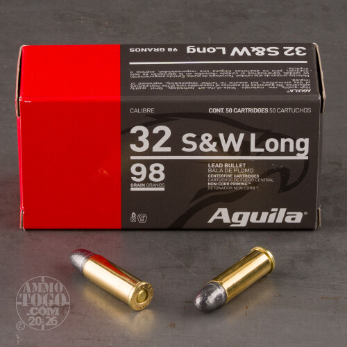 This is .32 S&W Long Aguila 98gr. Lead Round Nose Ammo. This ammo is brass cased, boxer primed and 100% non-corrosive. This ammo is manufactured by Tecnos Industrias, and is premium quality ammo. They are the exclusive manufacturers of ammo for the mexican military and police forces. This ammo is manufactured to military and SAAMI specs. It is packed in 50rd. boxes.