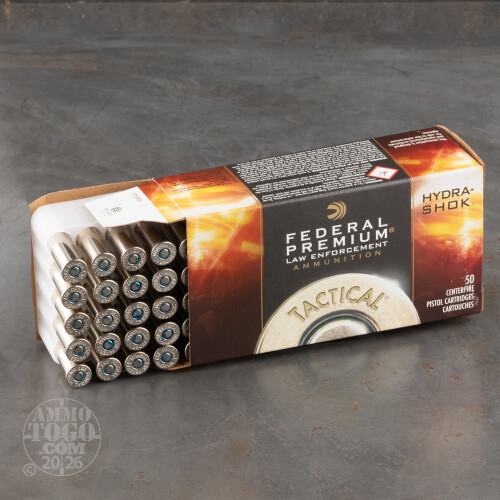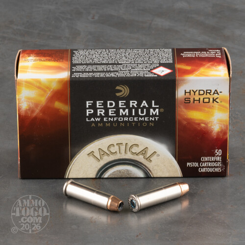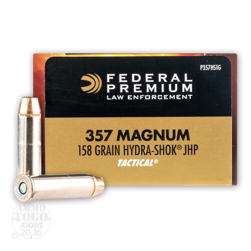 This package contains 50 rounds of Federal Premium Law Enforcement Tactical .357 Magnum ammunition. Each round is loaded with a 158 grain Hydra-Shok jacketed hollow point (JHP) projectile. With a unique center post design and a notched jacket, these projectiles provide amazing terminal performance and deliver maximum penetration. Use these loads for personal protection, whether on duty or off.