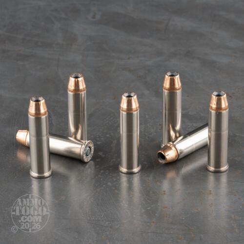 Each new production round is non-corrosive, boxer primed, and features a high-quality nickel-plated brass case for increased visibility and smooth function. Leaving the muzzle at a velocity of 1240 feet per second, these loads deliver a consistent muzzle energy of 539 foot pounds.