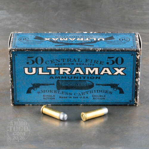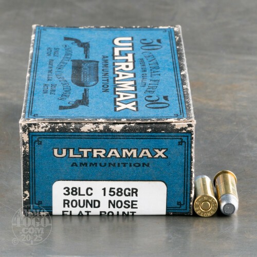 This is .38 Long Colt Ultramax 158gr. Round Nose Flat Point Ammo. Ultramax ammunition is shipped in unique, 1800s inspired ammunition cartons. This round provides the authentic look and feel, with twenty-first century accuracy. This ammo comes packed in 50rds. per box.