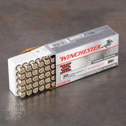 This is 38 Super Auto Winchester 125gr. Silvertip Hollow Point Ammo. Winchester Super-X Silvertip Ammo offers a unique combination of power, precision, reliable functioning and on-target performance, via a specially engineered jacketed bullet. This bullet delivers penetration and rapid energy release with virtually no weight loss or bullet fragmentation. This is the recommended ammo of many handgun manufacturers, due to it's reliable functioning. It is a tried and true hollow point for self defense. This ammo is packed in 50rd. boxes.