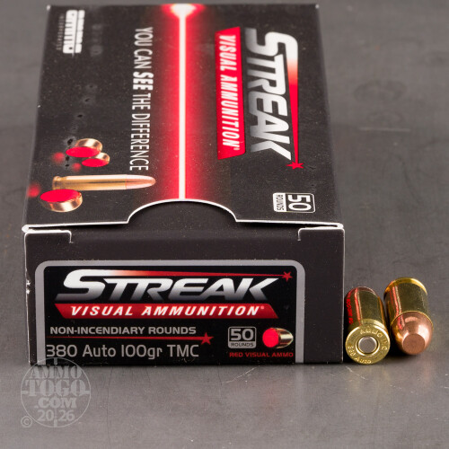 50rds – 380 Auto Ammo Inc. Streak 100gr. TMJ Non-Incendiary Visual Tracer Ammo Details