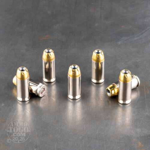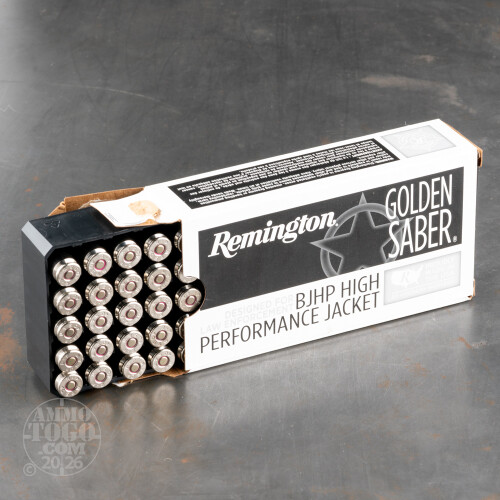 This 40 S&W cartridge from Remington Golden Saber features a very special 165 grain JHP. Its jacket is made of brass instead of traditional copper, and as the result is a lot harder than usual. This greatly benefits the bullet’s ability to defeat a barrier -- even two sheets of 20 gauge steel can’t take more than one percent of its weight away from it. As the BJHP burrows within its target, it consistently postpones expansion until it enters the vital area. At that point its spiral cut serrations cause it to open up, consistently to wider than the ideal set forth by the FBI test protocol, to cause massive cavitation.This round is a great choice for self-defense when it’s dark out. Its propellant is specially formulated to produce very little muzzle flash, so your eyes won’t become unaccustomed to the dark. Its brass casing is plated with shiny nickel that facilitates a chamber check. Low friction nickel also helps a semi-auto feed and extract more easily, and in conjunction with this round’s sealed primer and mouth protects against corrosive elements.