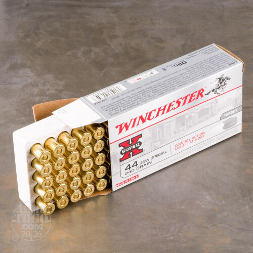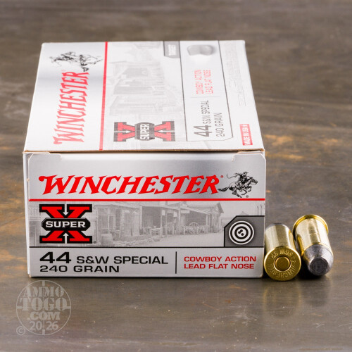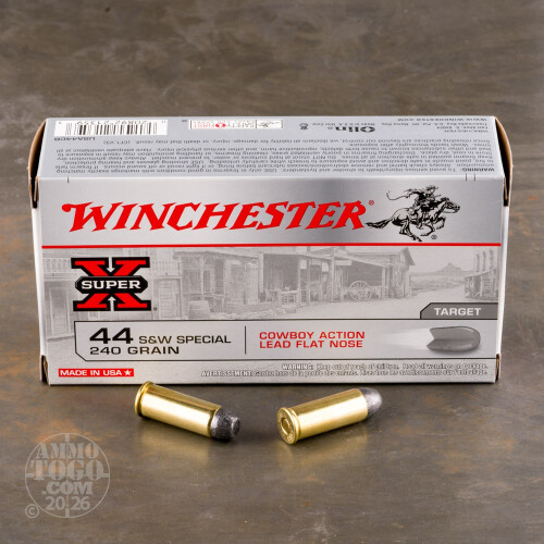 This is 44 Special Winchester Cowboy Action 240gr. Lead Flat Nose Ammo. This ammo is specifically designed to be safe to fire in all 44 Special revolvers and rifles. It also meets the criteria of all cowboy action contest rules. It has a muzzle velocity of 750 FPS. This ammo is brass cased, boxer primed and non-corrosive. It comes packed in 50rd. boxes.