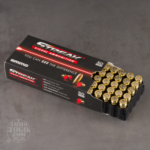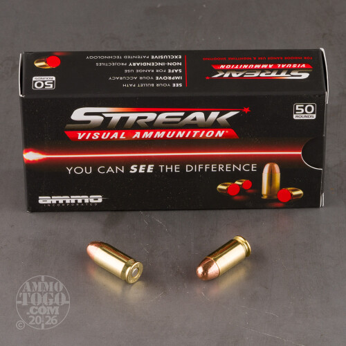 Eat however many carrots as you like. No amount of the roots will ever make your eyesight keen enough to see a 45 ACP bullet’s trajectory. But thanks to Ammo Inc. Streak ammunition, your bullets’ paths to their targets can become plain as the nose on your face!This cartridge’s bullet does not contain any flammable material or generate any heat. It only reflects light thanks to the luminescent dot on its base. When normal muzzle flash illuminates that dot, it trails red light that clearly marks the bullet’s trajectory. Ammo Inc. advises firing this non-incendiary tracer ammo in low lighting and indoor ranges, the latter of which it’s especially well suited for thanks to its total metal jacket projectile. The TMJ’s base is fully jacketed, so hot ignition isn’t capable of burning off any part of its isolated lead core. Streak ammo will let you see your bullet, but it won’t let you inhale any part of it!