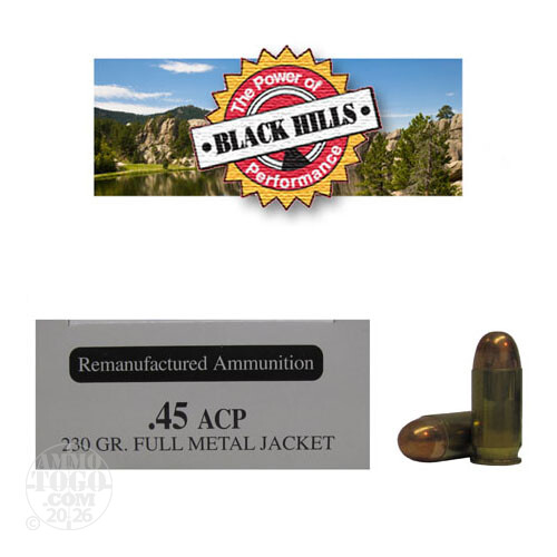 This is .45 ACP Black Hills 230gr. Remanufactured Seconds Full Metal Jacket Ammo. This ammo goes through Black Hills stringent inspection tests and due to minor cosmetic blemishes on the bullet or casing, it then becomes remanufactured seconds (white box) ammo. Performance is not affected. This is premium ammo, with a great savings. Black Hills Ammunition is highly respected all over the country. Black Hills supplies all five US military branches with ammunition. There are many Law Enforcement Agencies using Black Hills nationwide. They only use the best components available. This ammo is very accurate, dependable, brass cased and 100% non-corrosive. This ammo comes packed 50rds. per box.