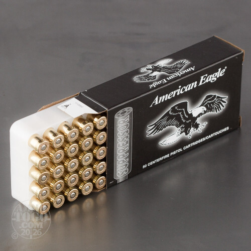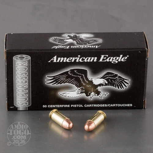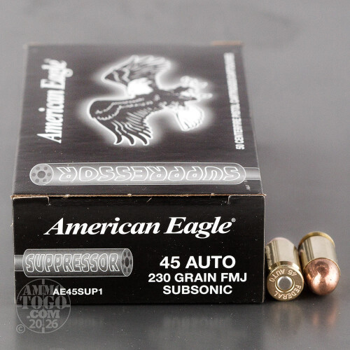 This 45 ACP cartridge is from Federal’s American Eagle Handgun Suppressor line of ammunition. It doesn’t achieve its subsonic 840 fps muzzle velocity by sporting an inordinately heavy projectile -- 230 grains is the standard for its caliber, after all. Rather, this round’s primer’s design and specially formulated propellant ensure that ignition won’t produce the cracking report that even a suppressor would be unable to stifle. It would still be a relatively quiet round even without a suppressor, but with one your shooting session will be about as noisy as a ninja sneaking across a concrete floor.This round’s projectile dons a total metal jacket. It provides all the advantages to performance that a full metal jacket would, but with the added benefit of protecting its core against hot propellant gasses. As the result you will enjoy breathing in relatively fewer toxic fumes while firing this round, something to weigh strongly in favor of if you plan to shoot indoors.
