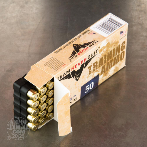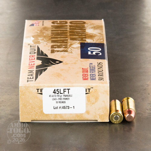 This .45 ACP ammunition is developed by some of the top companies in the ammunition industry including Sinterfire, PNW Arms, and Snake River Shooting Products. It is a frangible training load firing 155 grain bullets that break apart into harmless fragments upon contact with steel targets or hard surfaces. Team Never Quit ammo was evaluated and endorsed by Navy SEAL veteran Marcus Luttrell and uses non-corrosive Boxer primers and brass cases.-