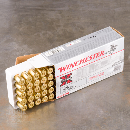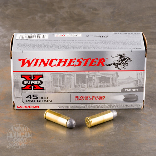 This is 45 Long Colt Winchester Cowboy Action 250gr. Lead Flat Nose Ammo. This ammo is specifically designed to be safe to fire in all 45 Longh Colt revolvers and rifles. It also meets the criteria of all cowboy action contest rules. It has a muzzle velocity of 750 FPS. This ammo is brass cased, boxer primed and 100% non-corrosive. It comes packed in 50rd. boxes.