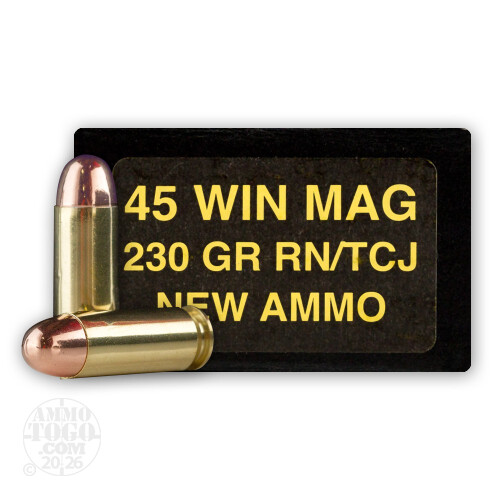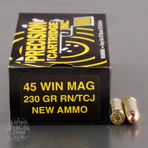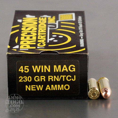 This is 45 Win Mag Precision Cartridge Inc. 230gr. Total Metal Jacket Ammo. This PCI round features Full Copper Jackets which reduce lead exposure on indoor ranges. This ammo is packed in 50rd. boxes.