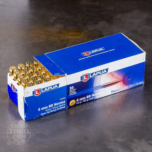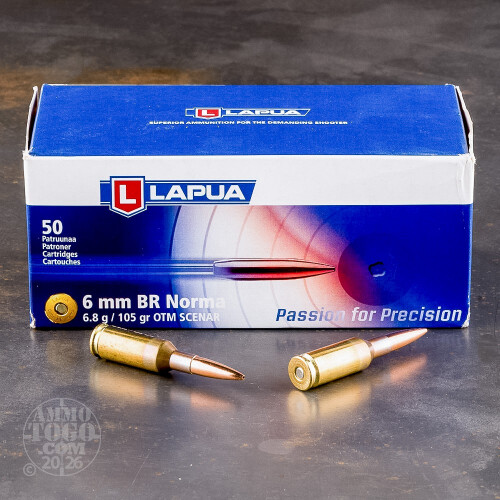 This is 6mm Norma B.R. Lapua Scenar 105gr. Open Tip Match Ammo. 6mm BR and 6mm BR Norma use the same case specifications however the difference between the two is the cartridge overall length specification with the BR Norma utilizing a longer heavier bullet. Always make sure to use the correct ammunition in the firearm being shot. This ammo is in new production, boxer primed, non-corrosive and reloadable brass cases. This ammo comes packed 20rds. per box.