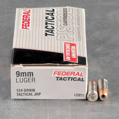 This package contains 50 rounds of Federal LE Tactical 9mm ammunition. Each round is loaded with a 124 grain hollow point projectile with a bonded copper jacket design. The bonding process prevents core/jacket separation for maximum weight retention and superior penetration even through tough urban barriers.