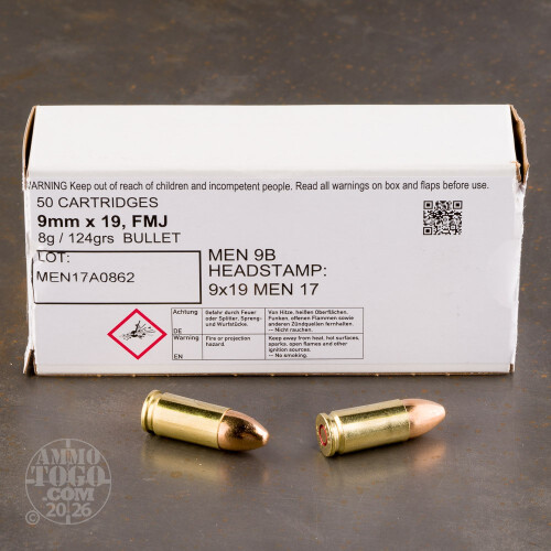 50rds - 9mm MEN 124gr. FMJ Ammo