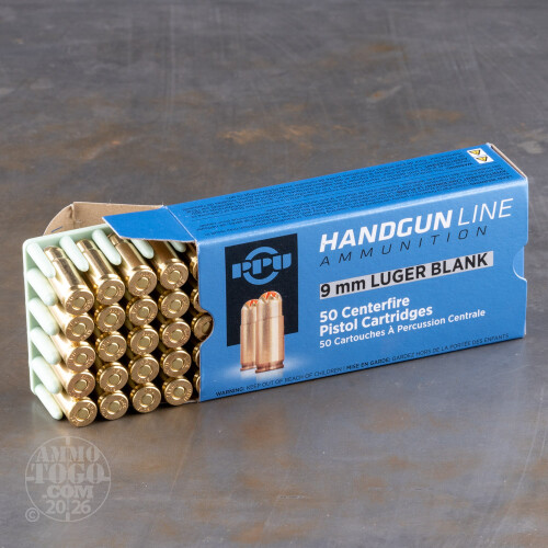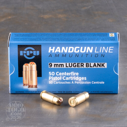 This 50 round box of 9mm Luger blanks is perfect for those times when you want to simulate gunfire without actually firing bullets. These rounds will not cycle semi automatic firearms without modification. Exercise caution when handling guns loaded with blanks, as close range discharges can still injure or kill. This ammo is loaded in Serbia by Prvi Partizan and uses non-corrosive Boxer primers.-