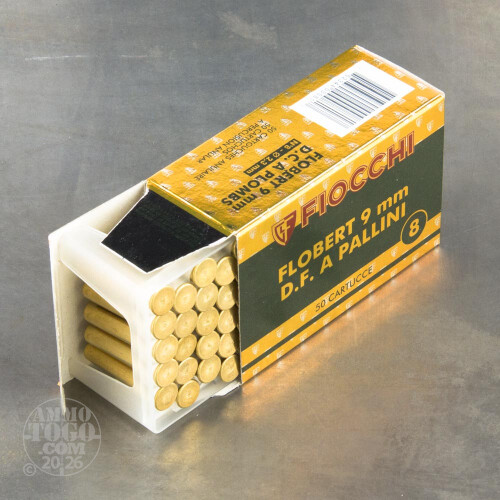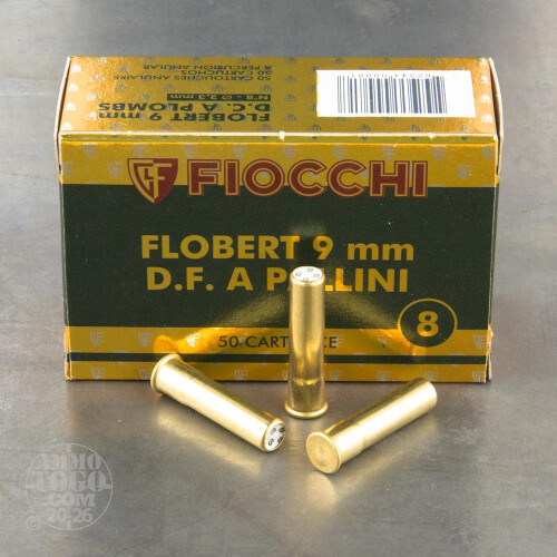 This is 9mm Rimfire Flobert Fiocchi 1 3/4" 1/4oz. #8 Shot Ammo. This ammo has brass cases and is non corrosive. It comes packed in 50rd. boxes. Muzzle Velocity: 600 fps.