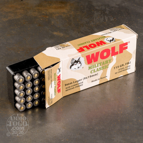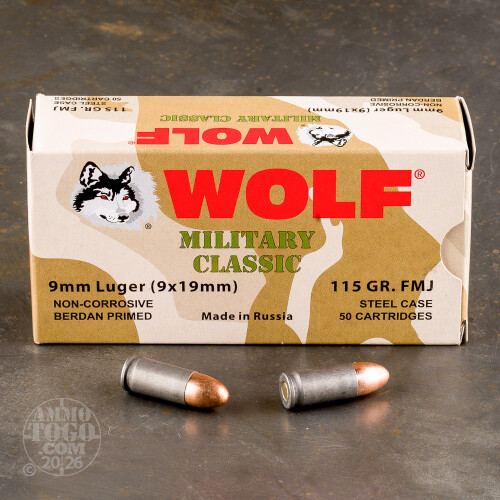 This is Wolf Performance Ammunition Military Classic 9mm 115gr. Full Metal Jacket Ammo. This ammo is manufactured in Russia. Wolf is the only ammunition company that provides a 100% Performance Guarantee. The polymer coated steel case ensures smooth feeding and extraction. This ammo has a bimetal bullet, and is berdan primed and non-corrosive. This ammo comes packed in 50rd. boxes, 10 boxes per case.