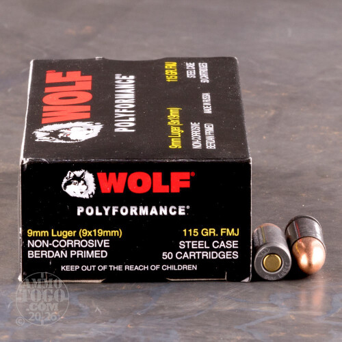 This is 9mm Wolf Performance Ammunition Polyformance 115gr. Full Metal Jacket Ammo. This ammo is manufactured in Russia. Berdan primed, non-corrosive, polymer steel case sealed for moisture protection. It comes packed in 50rd. boxes.
