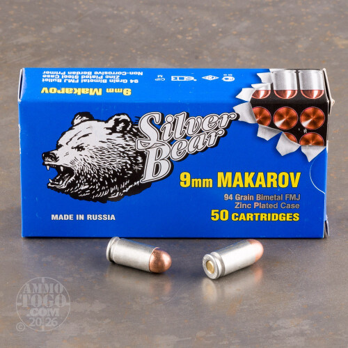 50rds - 9x18 Makarov Silver Bear 94gr. FMJ Ammo Details