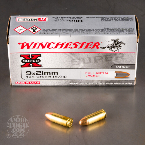 This is 9x21mm Winchester 124gr. Full Metal Jacket Ammo. Also know as Israel Military Industries or 9mm IMI. This ammo is brass cased, boxer primed, and non corrosive. This ammo comes packed in 50rd. boxes.