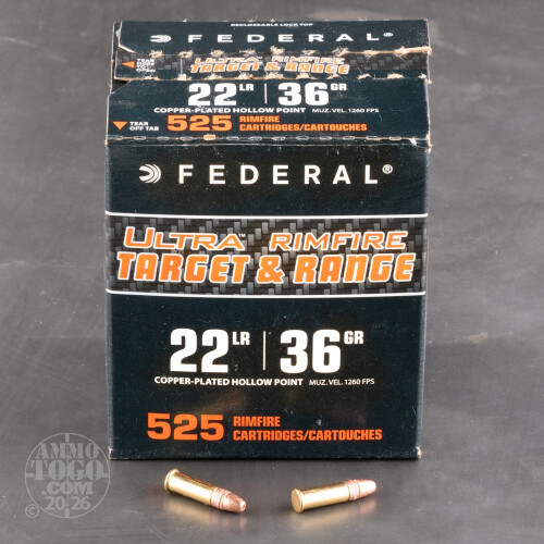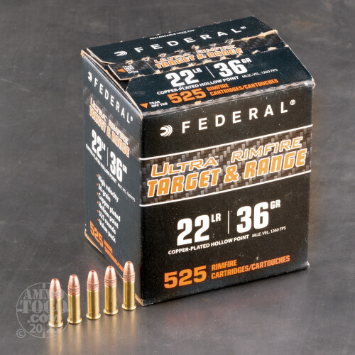 This 5250-round case of .22LR ammo is reliable range ammunition by Federal Ultra. This American-made ammo is extremely lightweight with a 36gr. copper-plated hollow point (CPHP) bullet. These rounds are rimfire-primed and loaded into new-production brass casings produced in Federal's Anoka, Minnesota factory. When the CPHP hits a target, it mushrooms into a wide formation that makes it effective for hunting small animals as well as target practice. The design of the CPHP bullets helps prevent over penetration of a target, and the copper-plating reduces fouling in your barrel so you can get more range time between cleanings. Federal's nearly 100 years of manufacturing experience enables them to create high-performing ammunition at an affordable price. Don't miss out on this amazing opportunity to get your hands on 5250 rounds of this Federal Ultra ammunition.-