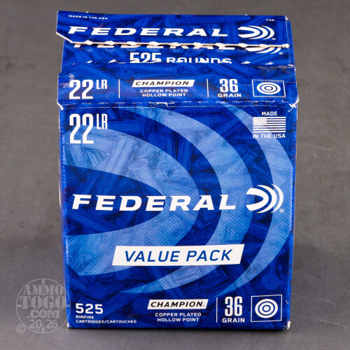 This is .22 Long Rifle Federal Champion 36gr. Copper Plated Hollow Point Ammo. This is some great inexpensive ammo for plinking or small game hunting. This ammo is packed in 525rd. value packs.