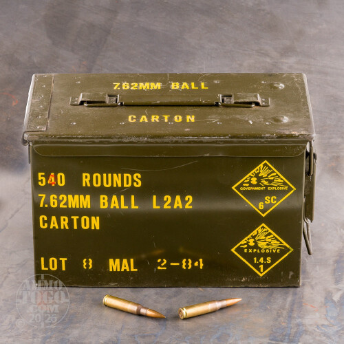 This surplus 7.62x51mm NATO ammunition has resurfaced at the perfect time to feed your CETMEs, Mossberg MVPs, and Kel-Tec RFBs. This ammo was originally made in Malaysia in the 1980s and closely follows M80 specifications; this includes the use of primer sealant around the border of triple-staked Berdan primers for maximum longevity. The primers are installed at the base of brass casings that have been heat treated for proper flexibility and chamber seal at the neck and shoulder; this contributes to consistent muzzle velocities. Each cartridge is finished using a 146-grain FMJ projectile.The shape of the bullet is quite aerodynamic and will also feed smoothly up classic and modern feed ramps. The bullet's jacket is made from a bi-metal material which may attract a magnet and be prohibited at indoor ranges. The 540-round bulk pack of ammunition is contained within a military standard .50 caliber ammo can for better storage life and easy transportation. Each OD green can features a folding carry handle, weatherproof lid gasket, clamping closure, and specific molding for vertical stacking.