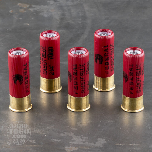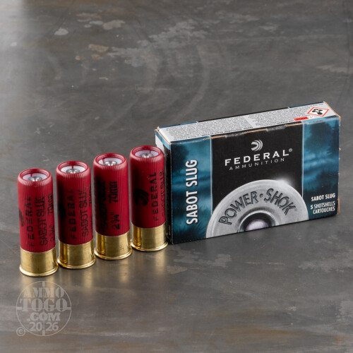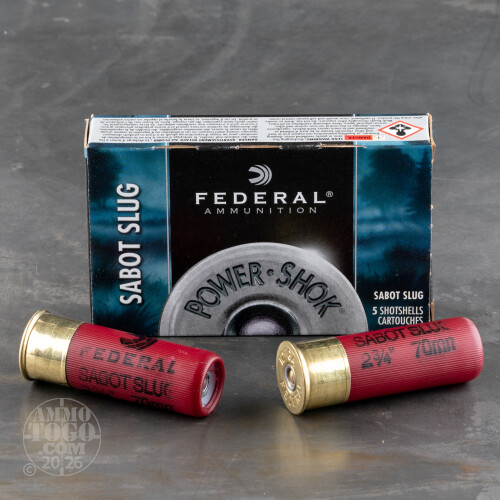 This is a 12 Gauge Federal 2 3/4" 1oz. Sabot Slug Ammo. Designed for light, thin skinned game such as whitetail, Federal's Power-Shok Sabot Slug in 12 Gauge provides exacting shot alignment and hard-hitting performance. Loaded with Federal's effective sabot slugs, this ammunition delivers high penetration and excellent accuracy without sacrificing the drop-right-there power of a full bore slug. Combined with Federal's reputation for quality, this round will give you the results on game you've been looking for at a cost you can afford. It comes packed in 5rd. boxes. Muzzle Velocity: 1500 fps.