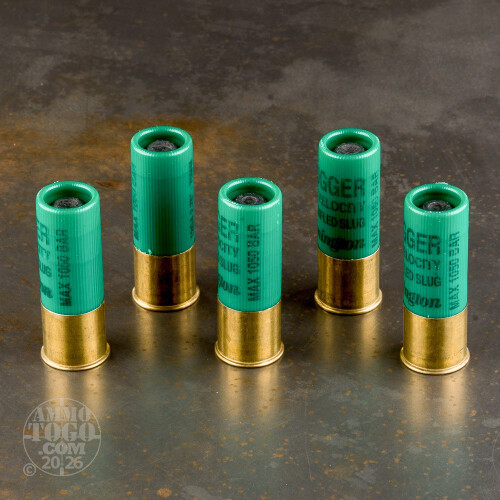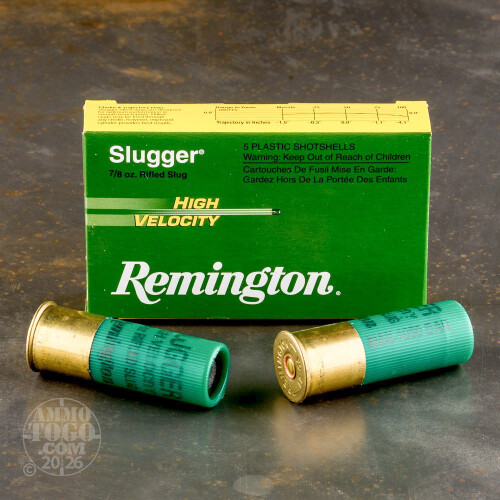 These 12 gauge rounds from the Remington Slugger line are a classic load known for high energy and a flat trajectory that smooth-bore deer hunters will cherish! Remington, the original makers of high-velocity foster slug shells, constructs these rounds using high-strength hulls, precisely measured propellant, and 7/8 ounce rifled lead projectiles. These lighter projectiles typically fly with 13% more muzzle velocity than 1 ounce slugs and deliver up to 200 foot-pounds more energy to the target as well.Each slug has rifling which imparts spin on the projectile when fired through a smoothbore shotgun barrel in order to achieve greater distance and accuracy. When the exposed lead slug impacts a target it will experience some slight expansion with a focus on deep penetration. This delivers devastating energy past thick hide and bone and into vital zones for more positive drops and successful hunting experiences.