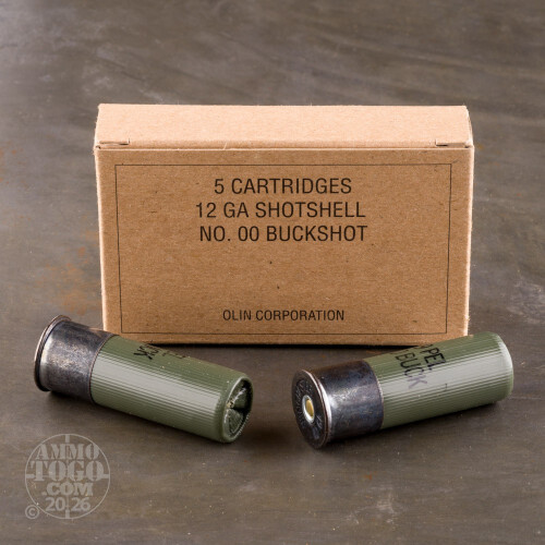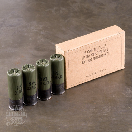These Olin marked 12 gauge shells are part of a well-known military contract overrun which has allowed private citizens to obtain high quality Winchester ammunition for self-defense and training purposes. Each of these shells is built with a high strength hull, crimped primer, and anodized aluminum high-brass head. This load calls for 9 pellets of 00 buckshot which is hardened and then buffered by Winchester's granulated "Grex" material; both features work to keep shot round for tighter groups and deeper penetration into a target.