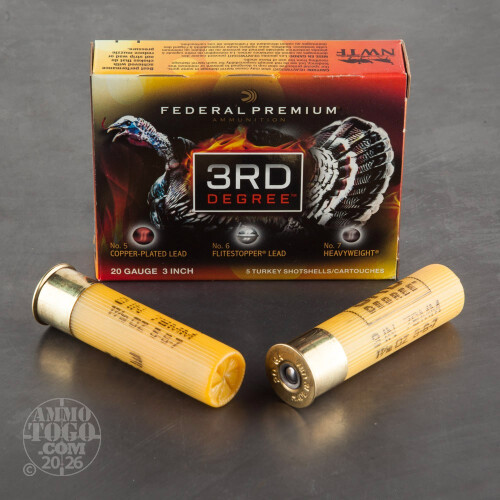 With these 1-7/16 ounce, 3",multi-shot turkey loads, get ready to bag turkey after turkey in situations you would have missed before. Featuring #5 copper-plated shot, #6 Flitestopper lead shot, and #7 heavyweight, these shells have you covered! When you take your trusty 20 gauge shotgun out into the woods, feel confident that your hunting trip will be successful with Federal 3rd degree in your shotgun!